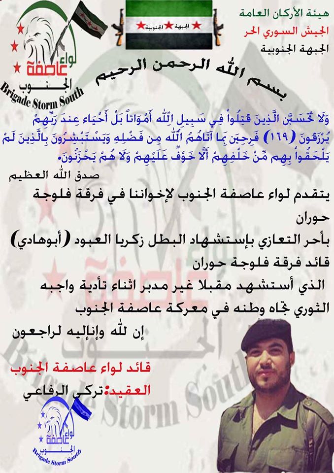 لواء عاصفة الجنوب يعزي فرقة فلوجة حوران بقائدها زكريا العبود