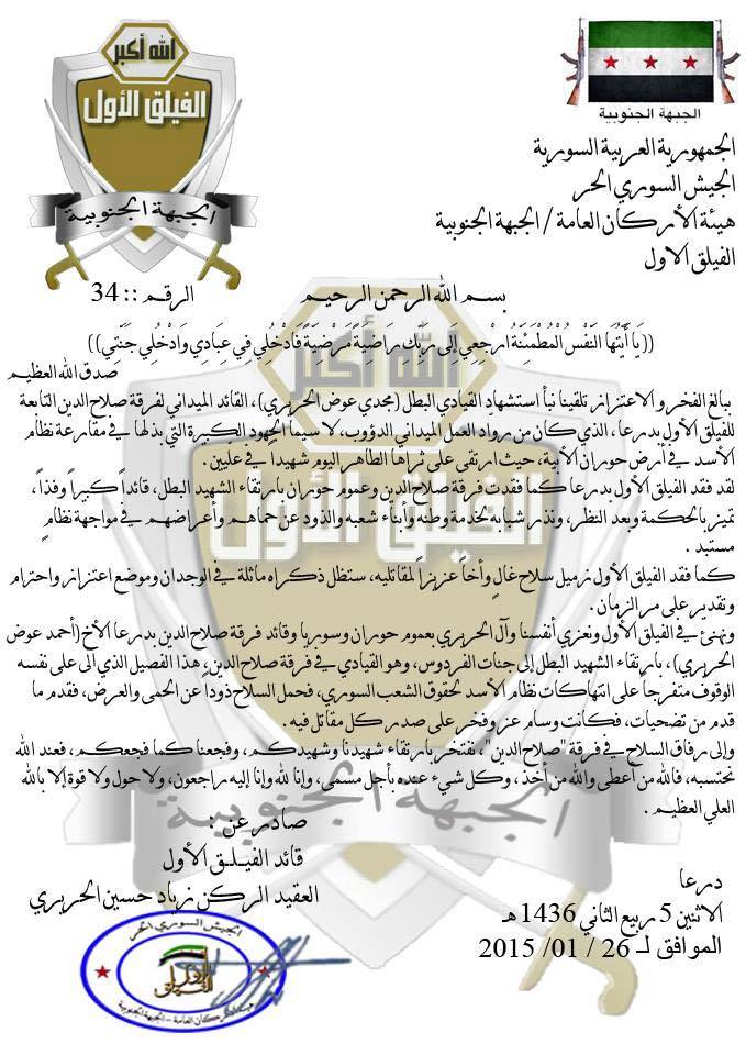 الفيلق الأول في درعا يعزي فرقة صلاح الدين بالقائد مجدي عوض الحريري