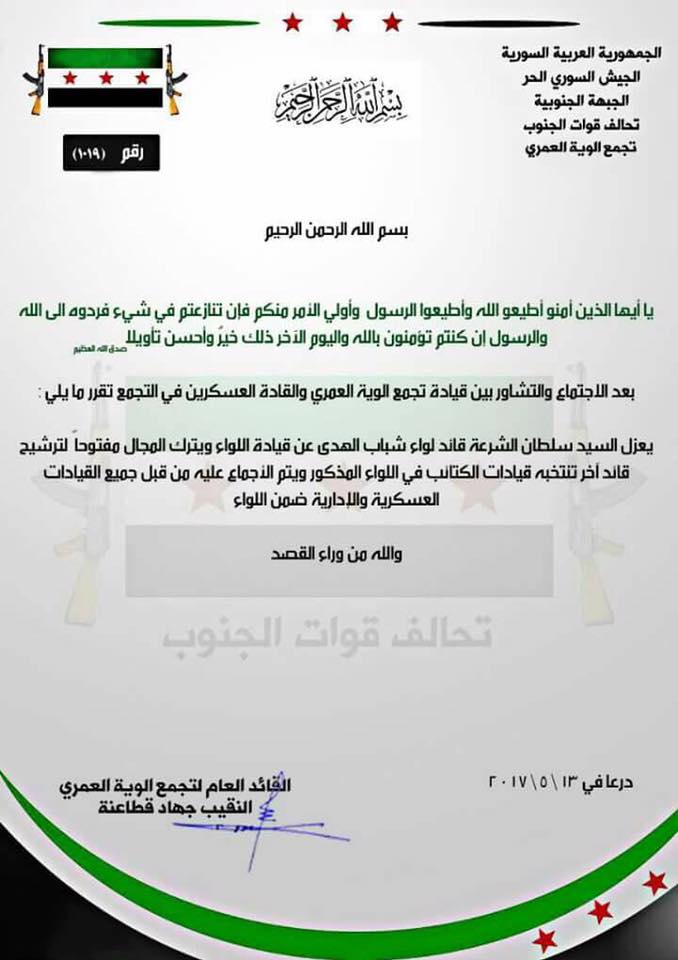قرار من تجمع ألوية العمري بعزل المدعو سلطان الشرعة عن قيادة لواء شباب الهدى