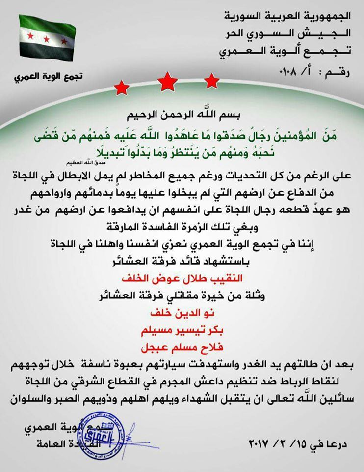 تجمع ألوية العمري يعزي فرقة العشائر بقائدها النقيب طلال عوض الخلف مع مجموعة من مقاتليها