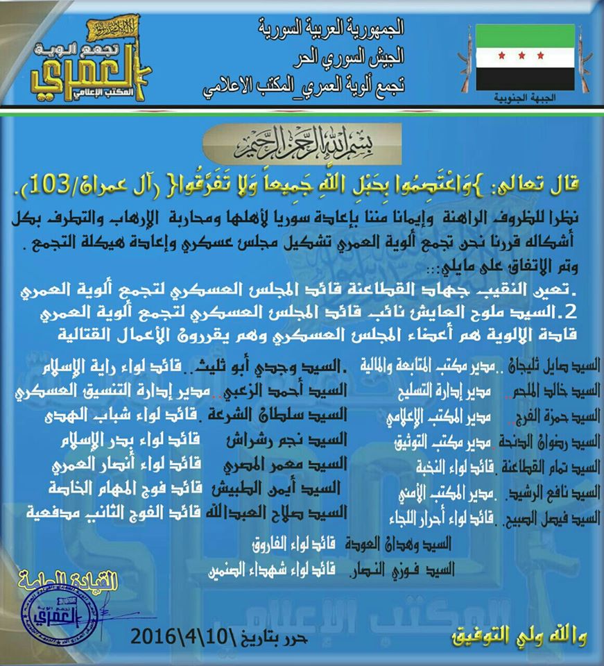 بيان حول إعادة هيكلة تجمع ألوية العمري و تشكيل المجلس العسكري للتجمع