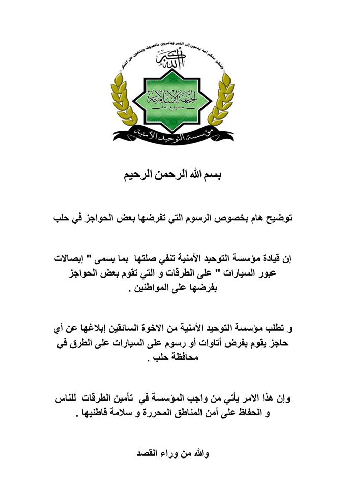 إن قيادة مؤسسة التوحيد الأمنية تنفي صلتها بما يسمى " إيصالات عبور السيارات " على الطرقات و التي تقوم بعض الحواجز بفرضها على المواطنين .