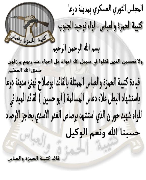 كتيبة الحمزة والعباس تعزي لواء شهيد حوران بقائده الميداني علاء دعاس المسالمة