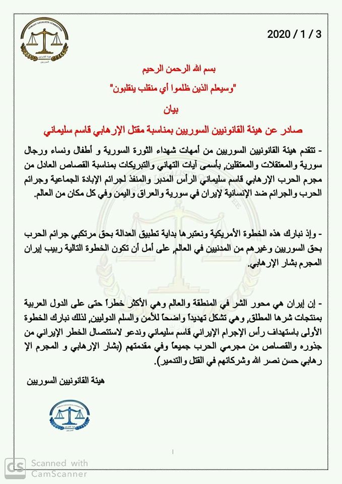هيئة القانونيين السوريين تصدر بيان خاص بمقتل الإرهابي المجرم قاسم سليماني