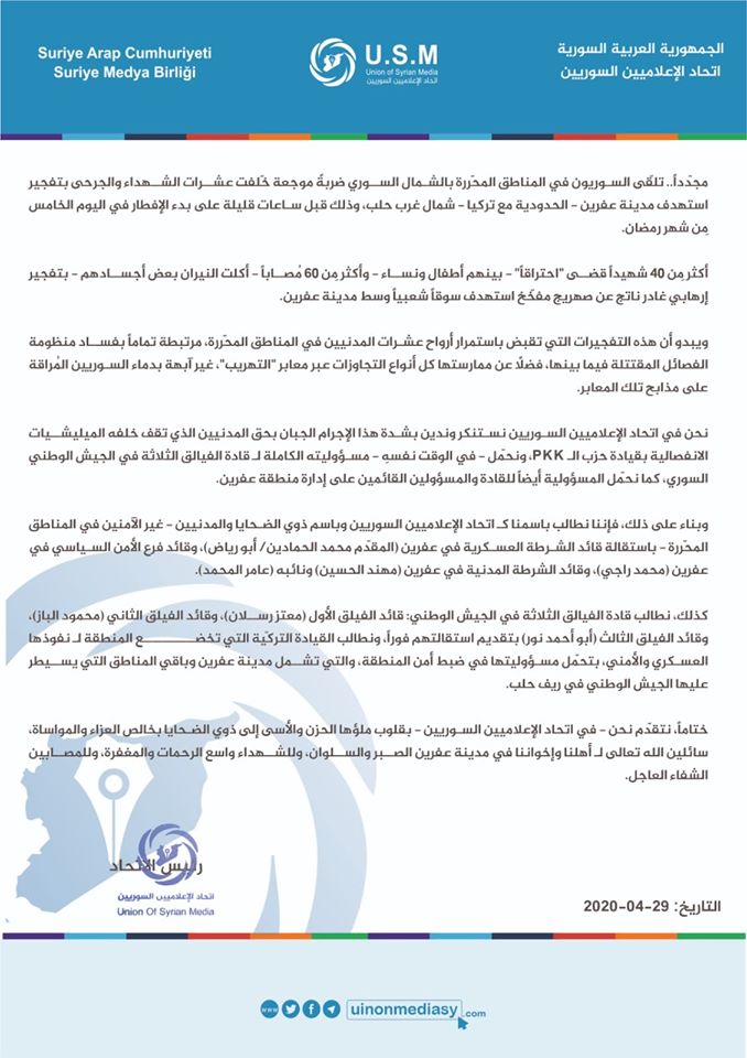 اتحاد الإعلاميين السوريين يدين التفجير الإرهابي الذي استهدف مدينة عفرين وأدى لسقوط عشرات الشهداء