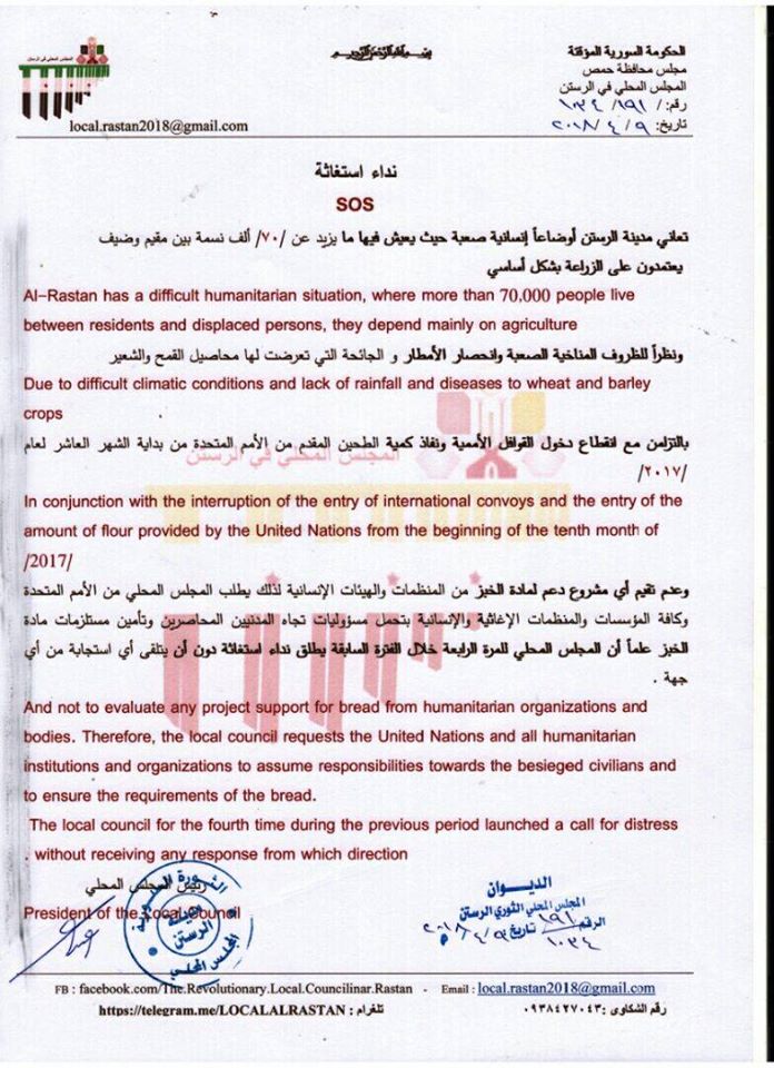 المجلس المحلي في الرستن يطلق نداء إستغاثة يحض فيه الجمعيات والمنظمات الإنسانية بالقيام بواجباتها تجاه أكثر من ٧٠ ألف نسمة يعيشون في المدينة ويعانون ويلات الحصار والحرب