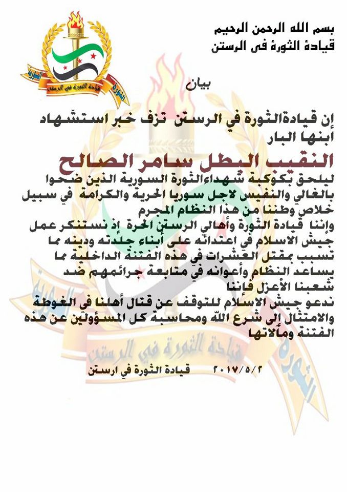قيادة الثورة في مدينة الرستن تنعي النقيب سامر الصالح