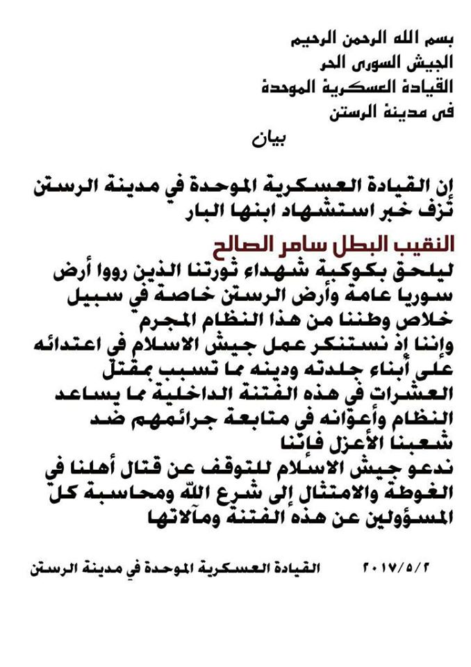 القيادة العسكرية الموحدة في مدينة الرستن تنعي النقيب سامر الصالح