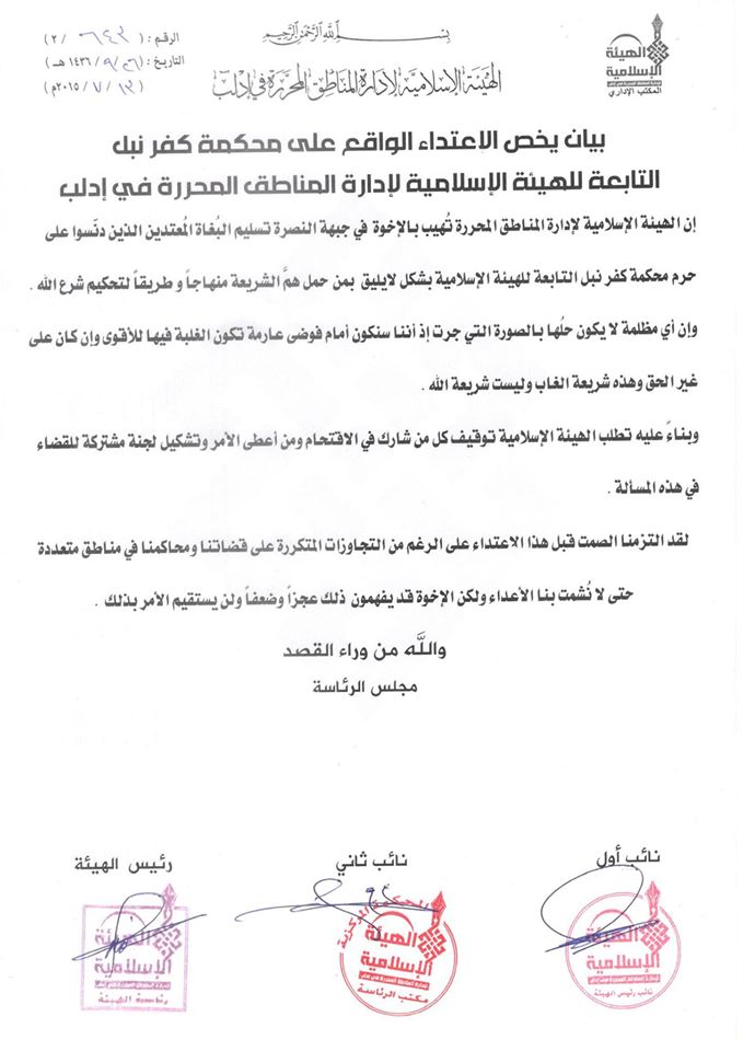 بيان يخص الإعتداء الواقع على محكمة كفرنبل التابعة للهيئة الإسلامية لإدارة المناطق المحررة في إدلب