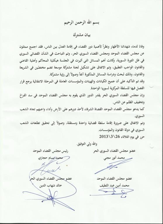بيان تشكيل لجنة مشتركة موسعة لدراسة وبحث الأمور المتعلقة بالقضاء في ظل الثورة السورية