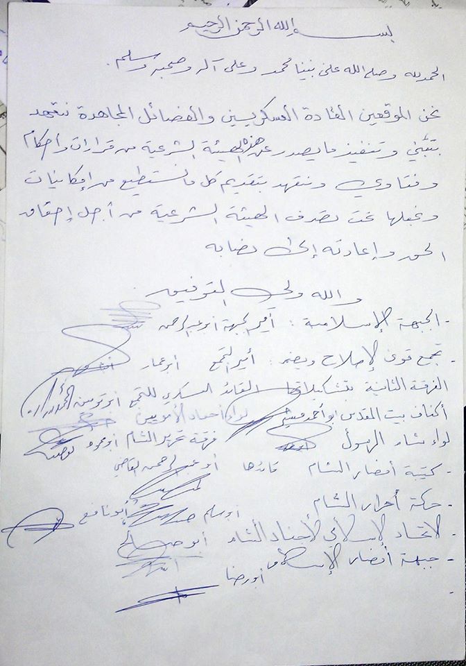 فصائل عسكرية توقع على ميثاق الهيئة وتتعهد بتبني وتنفيذ ما يصدر عن الهيئة الشرعية وتقديم كل ما تستطيع من إمكانيات ووضعها تحت تصرف الهيئة الشرعية