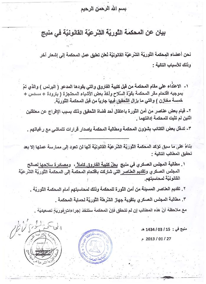المحكمة الثورية الشرعية في منبج والتابعة لمجلس القضاء الموحد في محافظة حلب إيقاف عملها من تاريخ 27-1-2012 وحتى إشعار آخر احتجاجًا على انتهاك حرمة المحكمة من قبل كتيبة الفاروق وذلك حتى يتم تنفيذ مطالبها