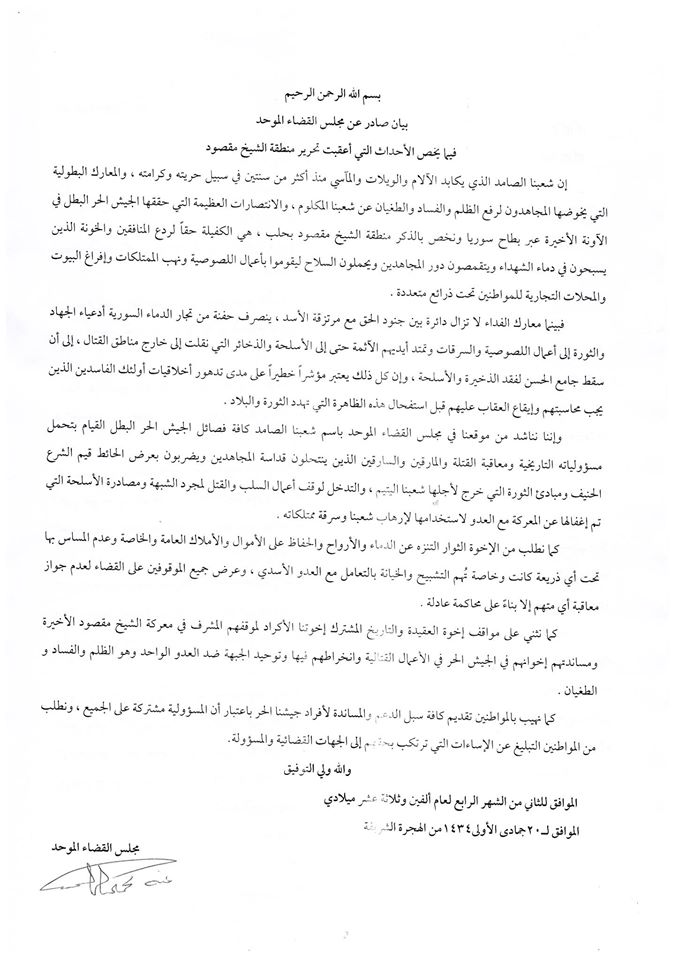 بيان صادر عن مجلس القضاء الموحد فيما يخص الأحداث التي أعقبت تحرير منطقة الشيخ مقصود