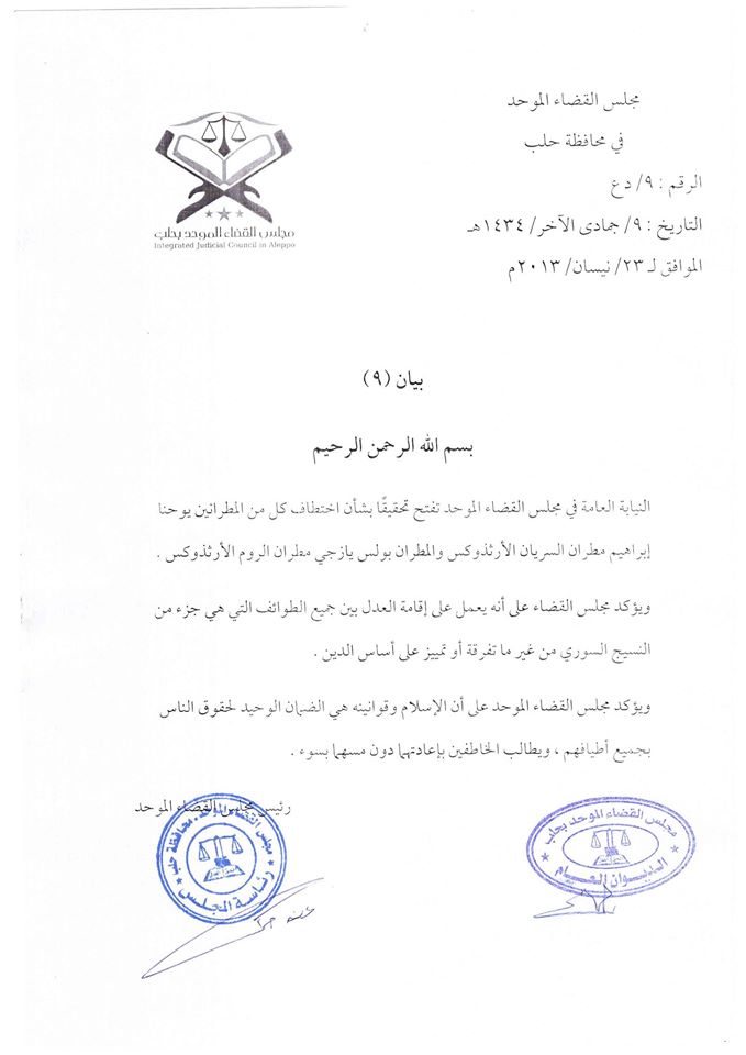 بيان رقم (9) الصادر عن مجلس القضاء الموحد في محافظة حلب بخصوص اختطاف كل من المطرانين يوحنا إبراهيم مطران السريان الأرثذوكس والمطران بولس يازجي مطران الروم الأرثذوكس .