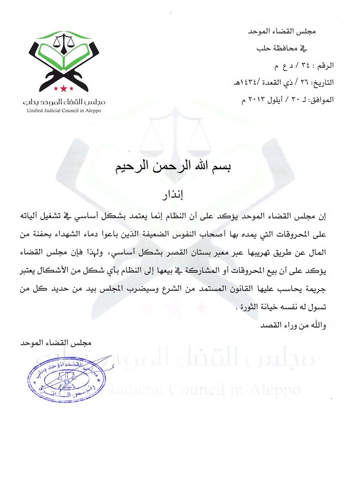 إن مجلس القضاء الموحد يؤكد على أن النظام إنما يعتمد بشكل أساسي في تشغيل آلياته على المحروقات التي يمده بها أصحاب النفوس الضعيفة الذين باعوا دماء الشهداء بحفنة من المال عن طريق تهريبها عبر معبر بستان القصر بشكل أساسي، ولهذا فإن مجلس القضاء يؤكد على أن بيع المحروقات أو المشاركة في بيعها إلى النظام بأي شكل من الأشكال يعتبر جريمة يحاسب عليها القانون المستمد من الشرع وسيضرب المجلس بيد من حديد كل من تسول له نفسه خيانة الثورة .