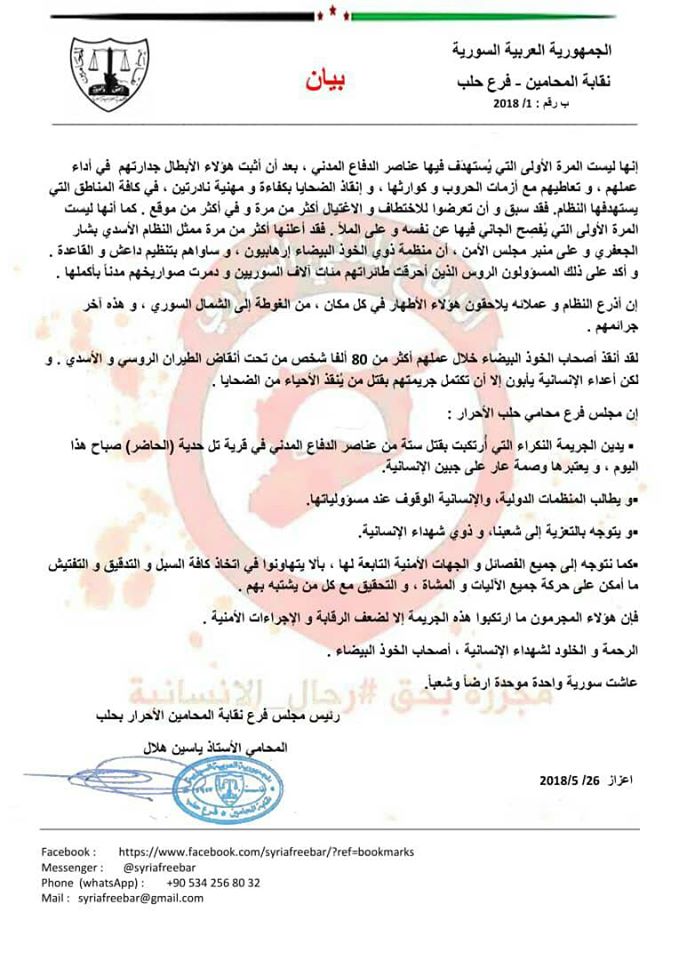 فرع نقابة المحامين الأحرار بحلب يدين استهداف عناصر الدفاع المدني