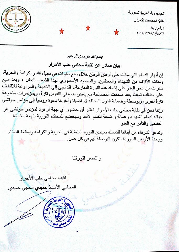 بيان نقابة محامي حلب الأحرار حول مؤتمر سوتشي