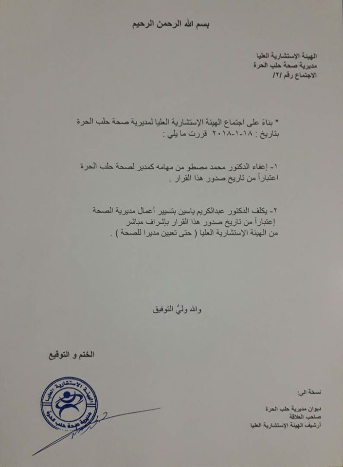 قرار من مديرية صحة حلب الحرة بإعفاء الدكتور محمد مصطو من مهامه كمدير لصحة حلب وتكليف الدكتور عبد الكريم ياسين بتسيير أعمال مديرية الصحة حتى تعيين مديراً للصحة