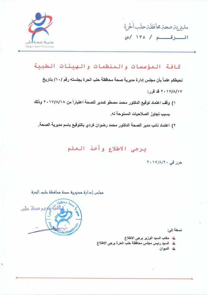 قرار إداري من مجلس إدارة مديرية صحة حلب الحرة بوقف اعتماد توقيع مدير الصحة محمد مصطو واعتماد توقيع نائب المدير محمد رضوان كردي