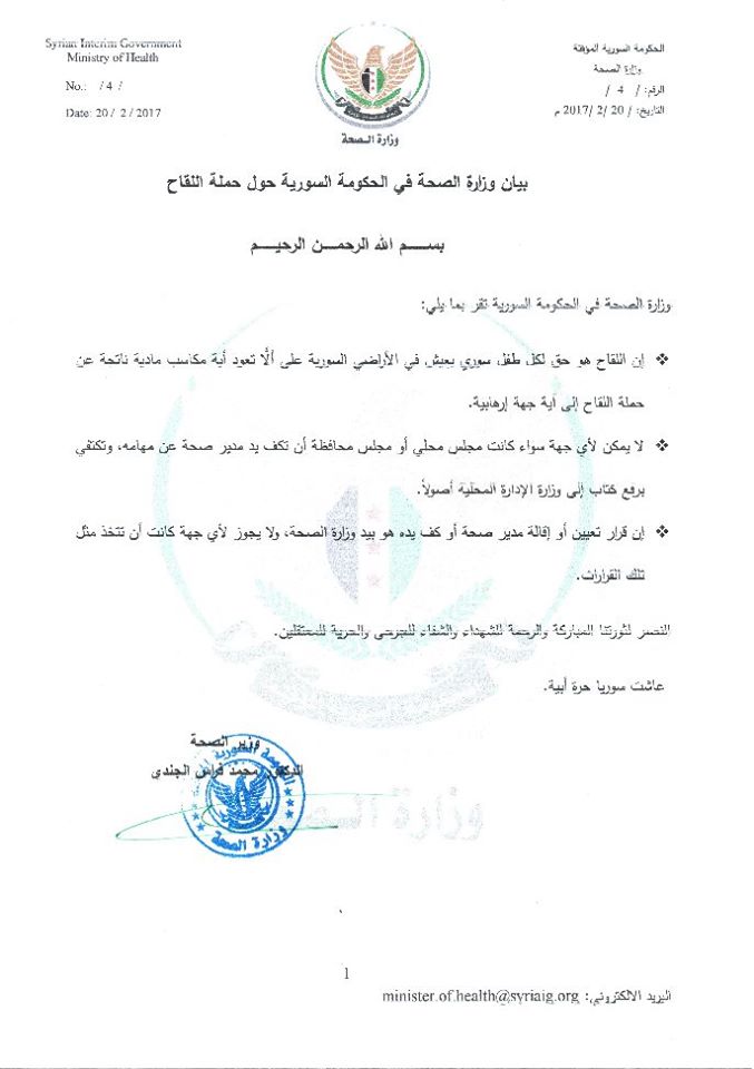 بيان وزارة الصحة في الحكومة المؤقتة فيما يتعلق بحملة اللقاح