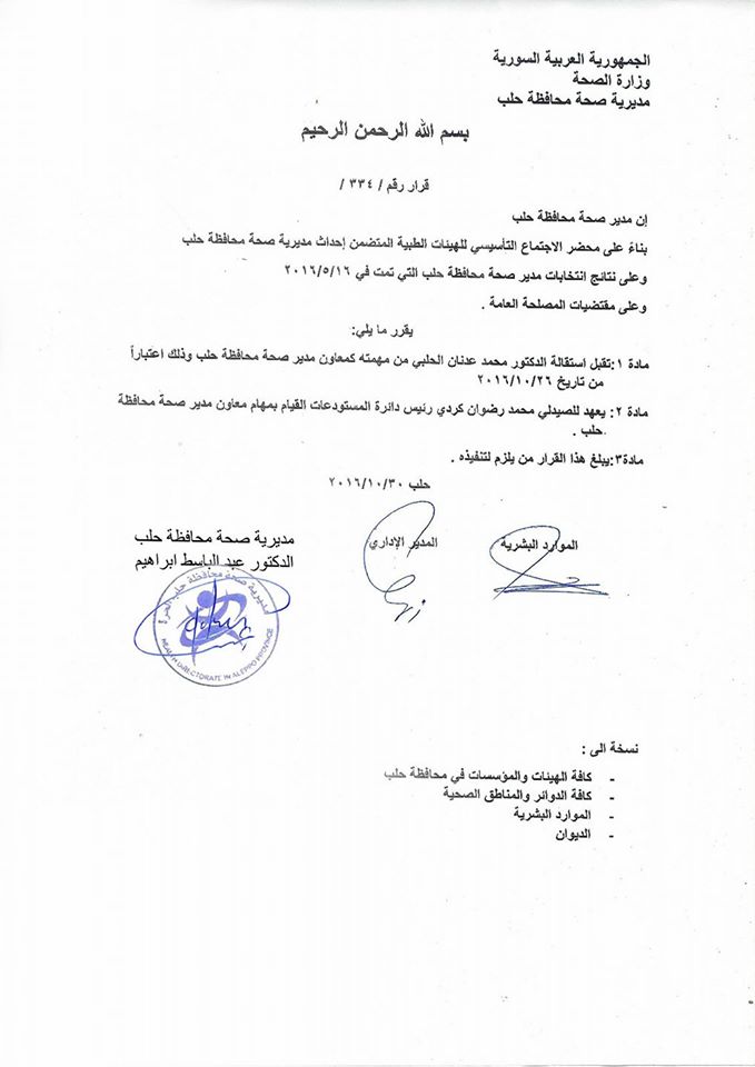 بيان صادر عن مديرية صحة حلب الحرة تلعن فيه قبول استقالة الدكتور محمد عدنان الحلبي من منصبه كمدير لصحة حلب الحرة