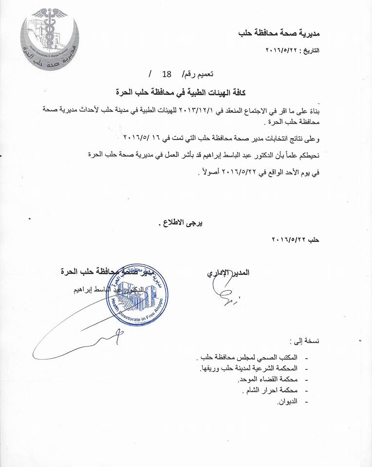 تعميم من مديرية صحة حلب الحرة إلى كافة الهيئات الطبية في محافظة حلب الحرة بشأن مباشرة الدكتور عبدالباسط إبراهيم لمهامه كمدير لصحة حلب