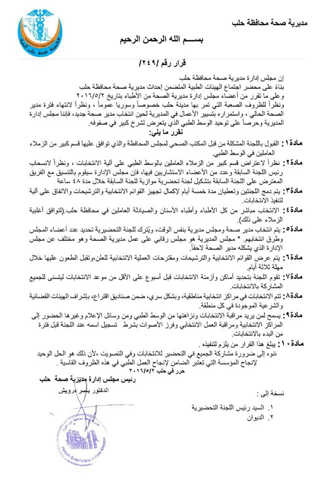 قرارات إدارية صادرة عن مجلس إدارة مديرية صحة حلب بشأن انتخاب مدير صحة حلب