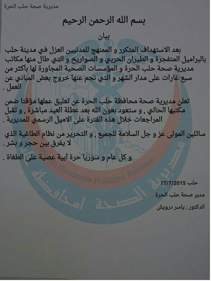 بعد الاستهداف المتكرر و الممنهج للمدنيين العزل في مدينة حلب بالبراميل المتفجرة و الطيران الحربي و الصواريخ و التي طال منها مكاتب مديرية صحة حلب الحرة و المؤسسات الصحية المجاورة لها بأكثر من سبع غارات على مدار الشهر و التي نجم عنها خروج بعض المباني عن العمل .