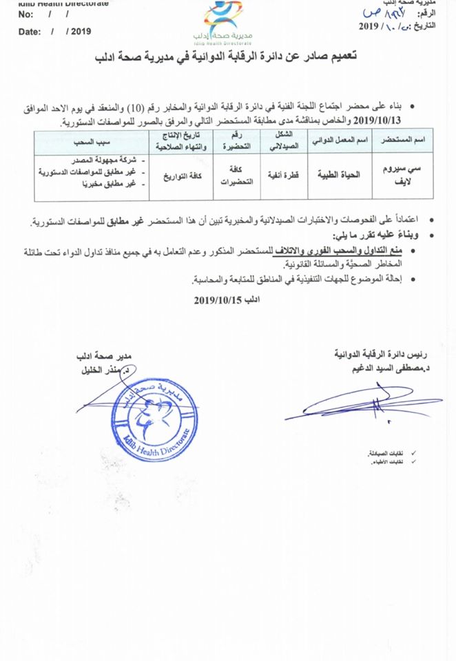 تعميم صادر عن هيئة الرقابة الدوائية التابعة لمديرية صحة إدلب