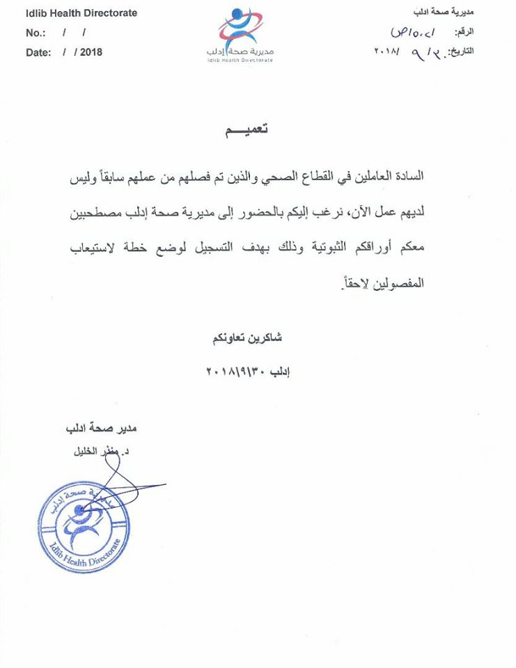 تعميم من مديرية صحة إدلب بخصوص العاملين المفصولين من قبل النظام