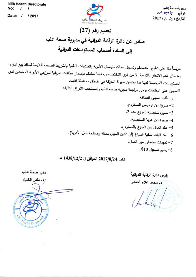 تعميم صادر عن دائرة الرقابة الدوائية في مديرية صحة إدلب بخصوص إصدار بطاقات خاصة بمندوبي المستودعات المُرخصة