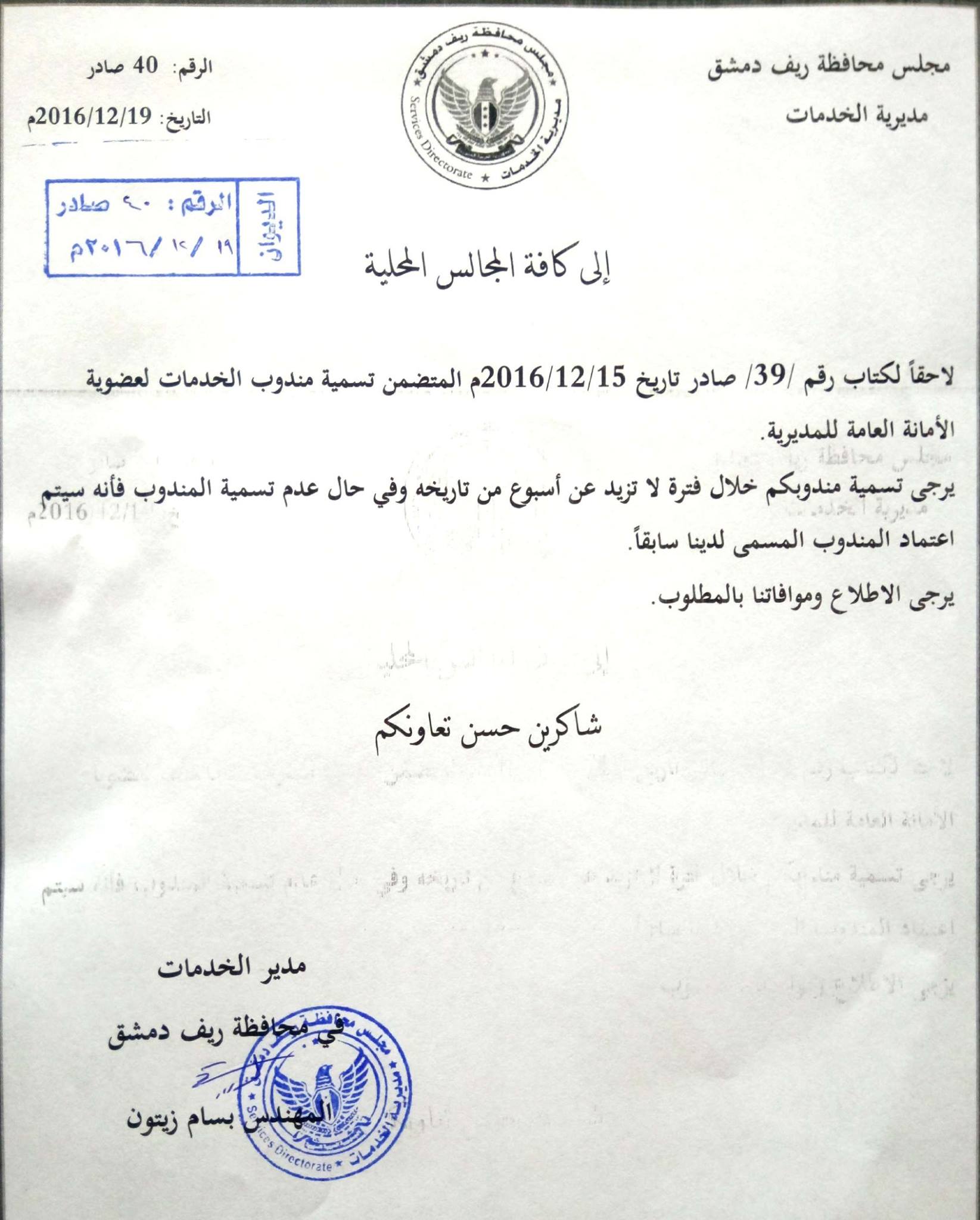 مديرية الخدمات في محافظة ريف دمشق تطالب جميع المجالس المحلية بتسمية مندوبها لدى المديرية