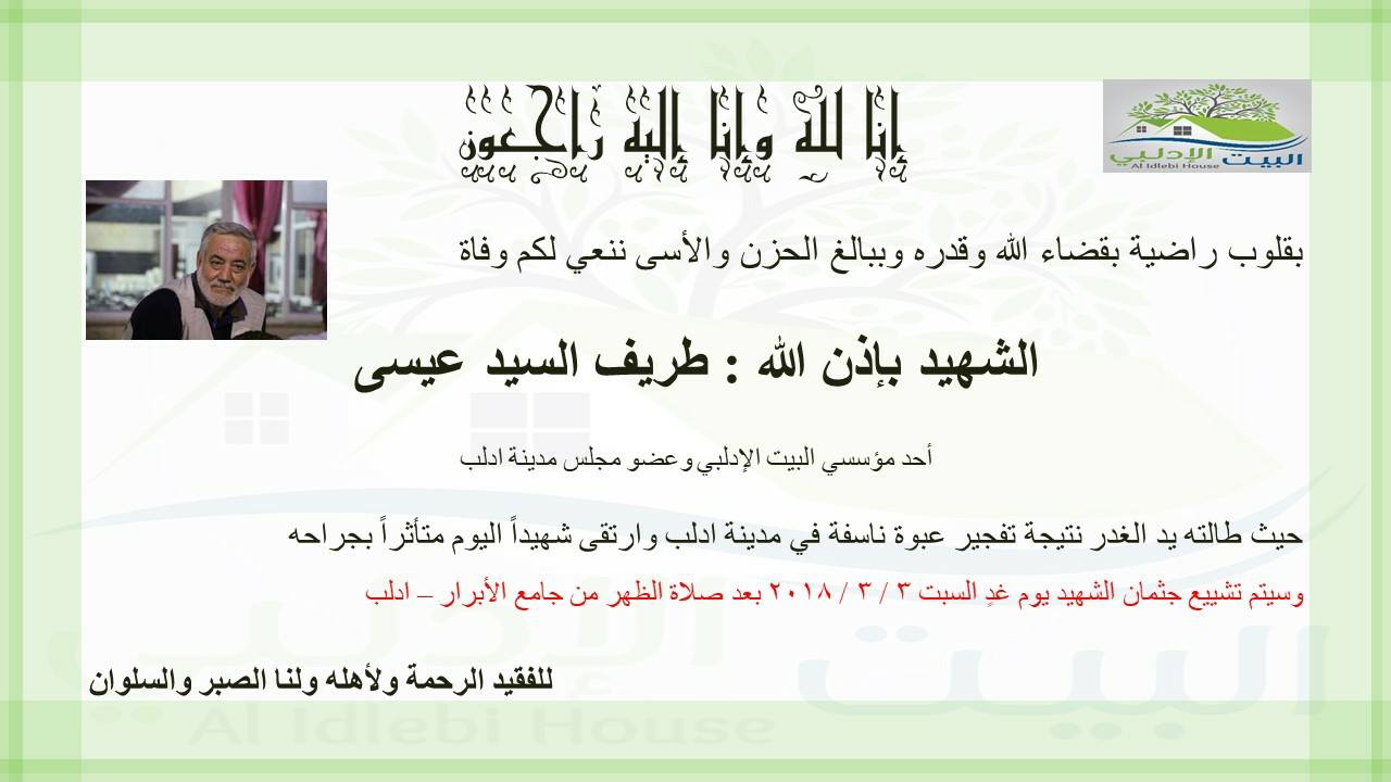 البيت الإدلبي ينعي طريف السيد عيسى أحد مؤسسي البيت الإدلبي وعضو مجلس مدينة إدلب بتفجير طاله في مدينة إدلب