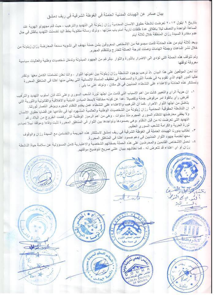 بيان صادر عن الهيئات المدنية العاملة في الغوطة الشرقية تضامناً مع الناشطة رزان زيتونة