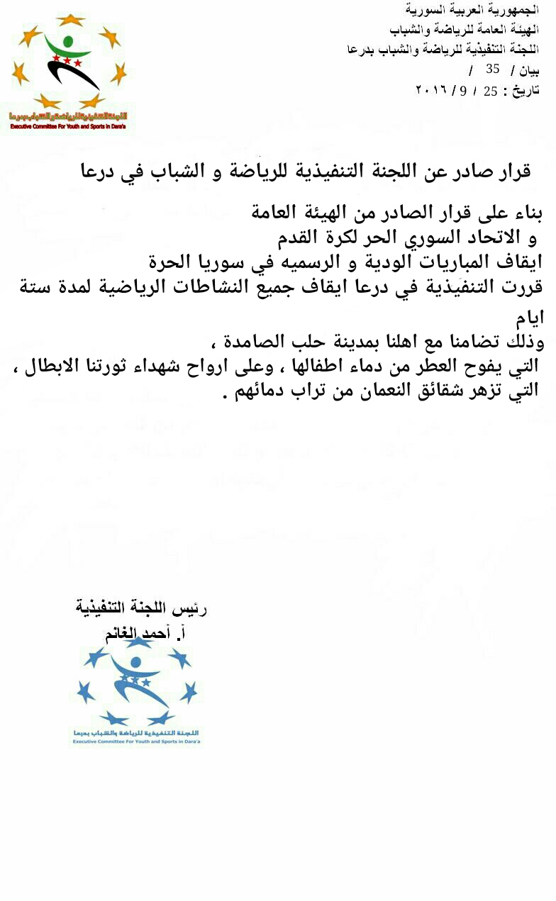 الهيئة الفرعية للرياضة و الشباب في محافظة درعا تعلن إيقاف النشاط الرياضي تضامناً مع مدينة حلب