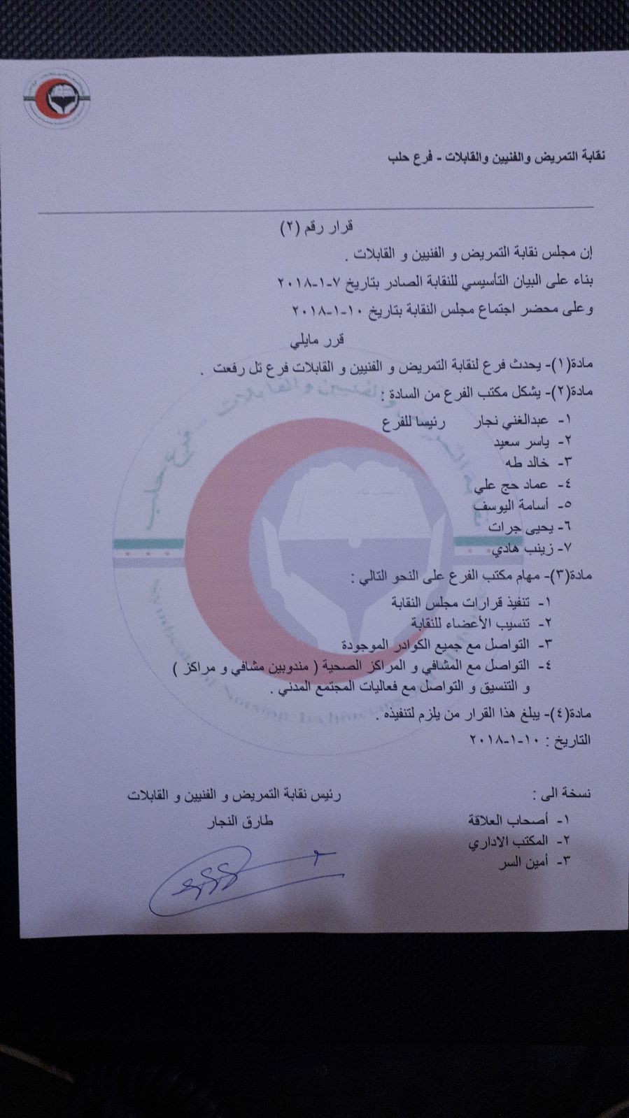 بيان من نقابة التمريض والفنيين والقابلات باستحداث شعبة في تل رفعت وتعين أعضاء لهذه الشعبة وتحديد مهامهم