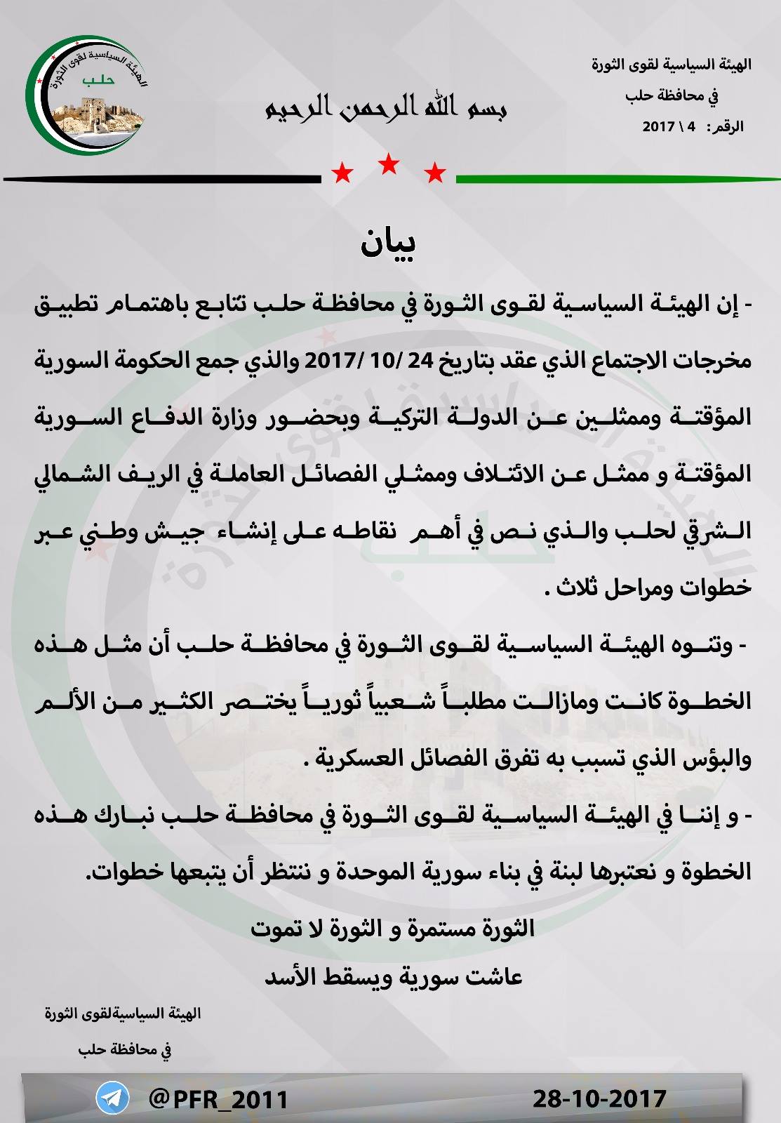بيان من الهيئة السياسية لقوى الثورة في محافظة حلب تثني و تحض فيه الفصائل على تنفيذ التوحيد الذي وعدت الشعب به ضمن جيش وطني موحد