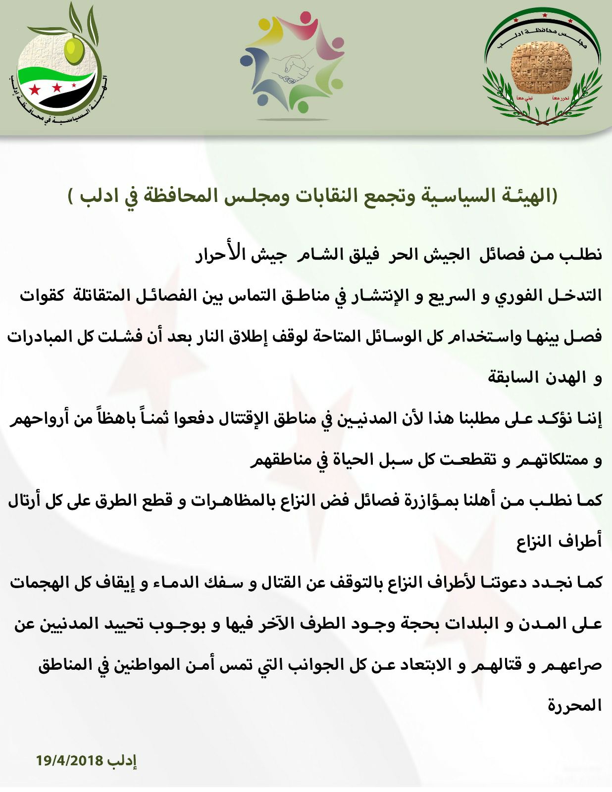 الهيئة السياسية في محافظة إدلب ومجلس النقابات ومجلس محافظة إدلب يطالبون من فيلق الشام وجيش الأحرار