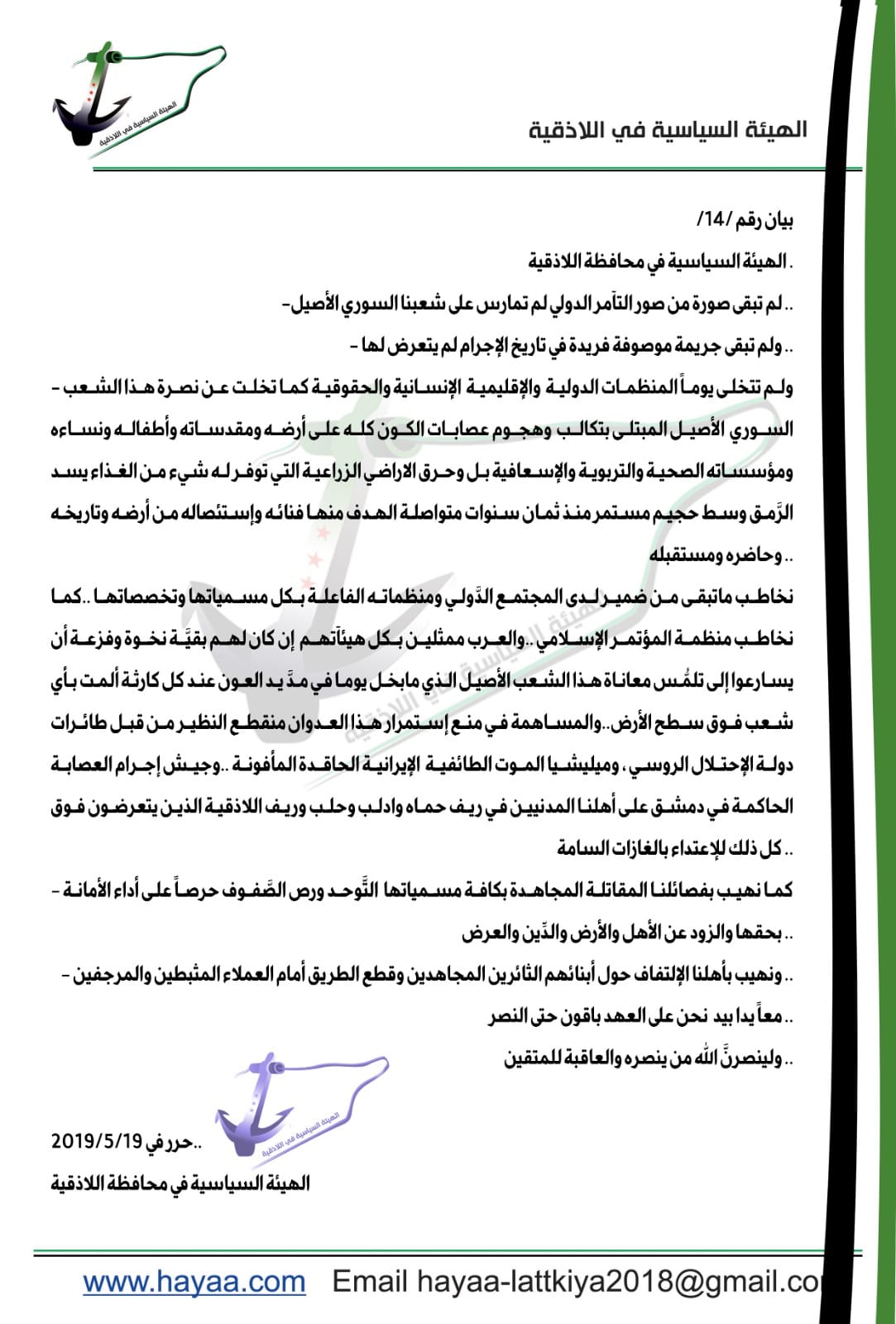 بيان مناشدة من الهيئة السياسية في اللاذقية للمجتمع الدولي لمد يد العون للشعب السوري وحمايته