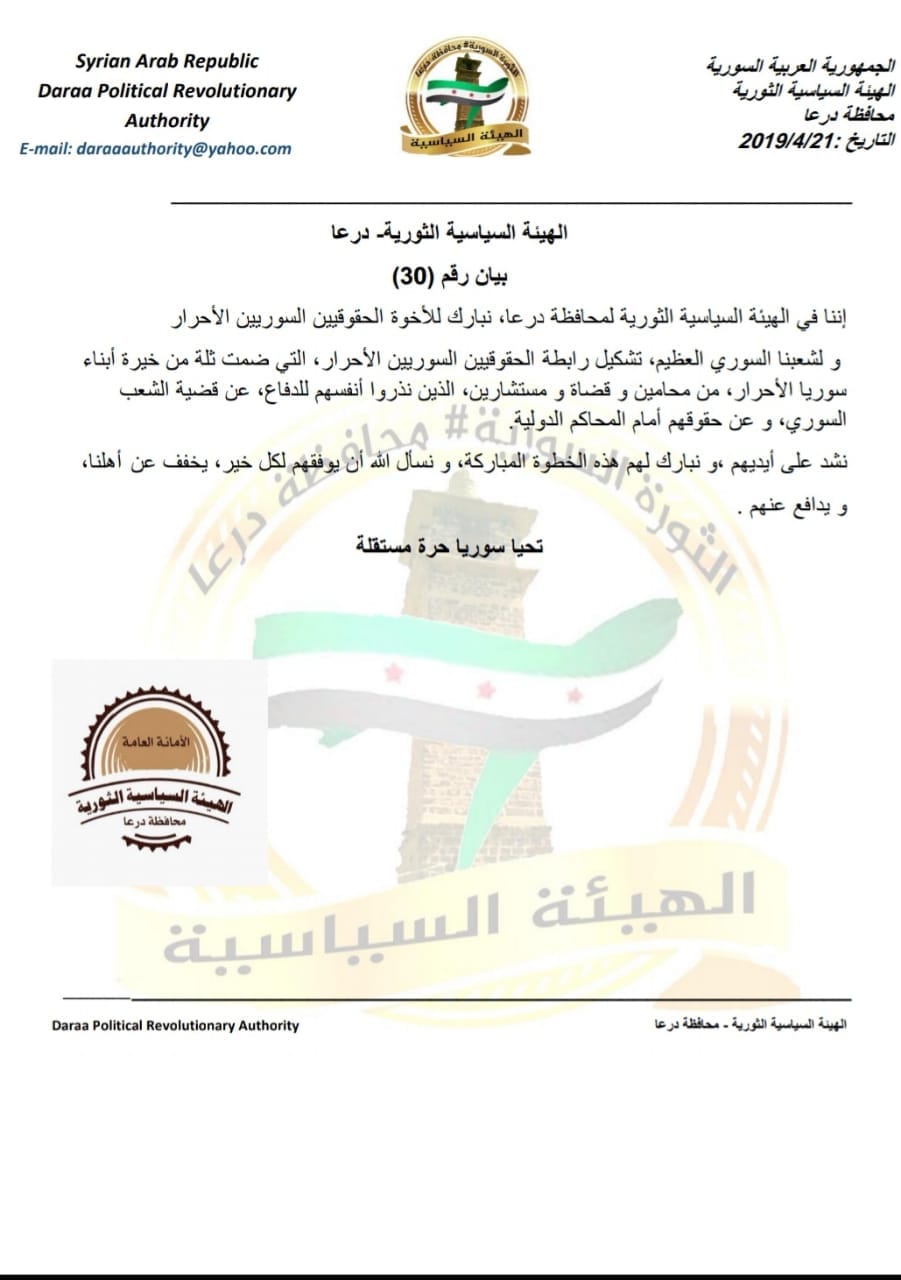 الهيئة السياسية الثورية لمحافظة درعا تبارك تشكيل رابطة الحقوقيين السوريين الأحرار