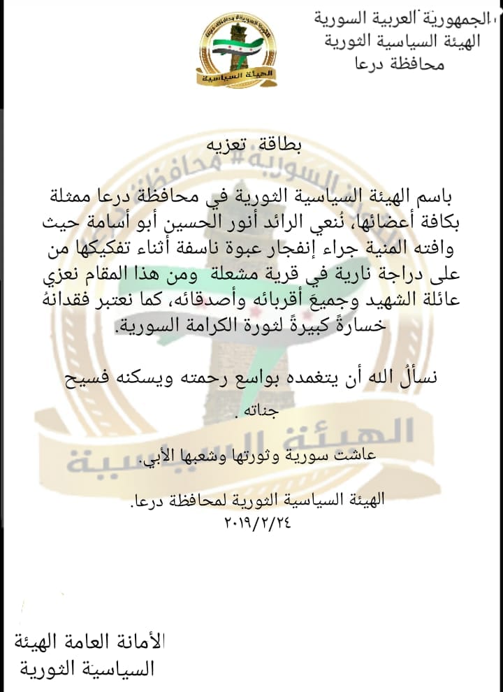 الهيئة السياسية الثورية لمحافظة درعا تعزي بالرائد أنور الحسين