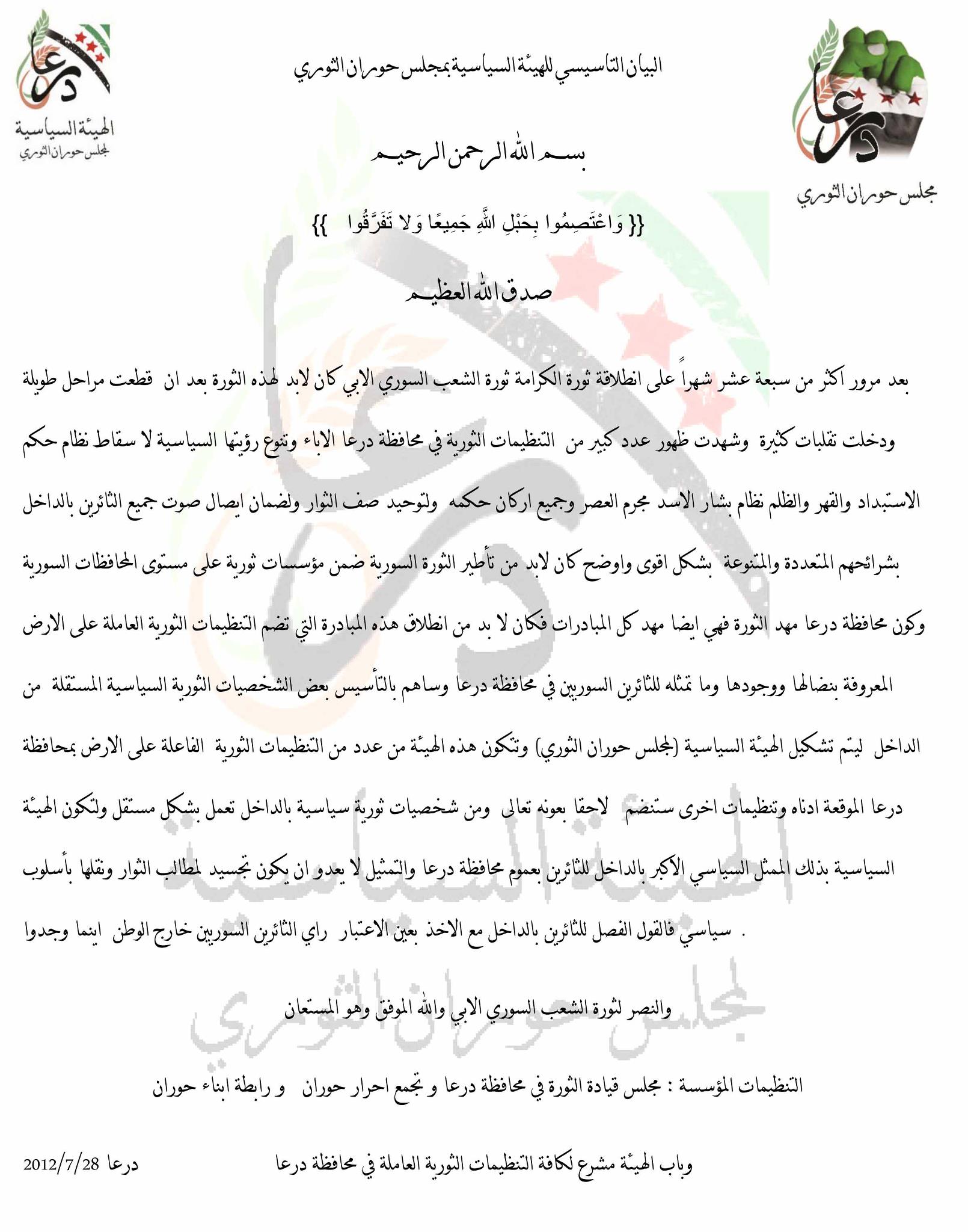 البيان التأسيس للهيئة السياسية بمجلس حوران الثوري