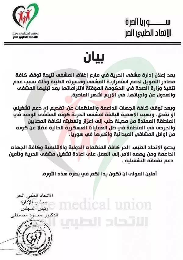 الإتحاد الطبي الحر في مدينة حلب وريفها يدعو كافة المنظمات الإقليمية والدولية والجهات الداعمة للعمل لإعادة تشغيل مشفى الحرية وتأمين نفقات تشغيلة
