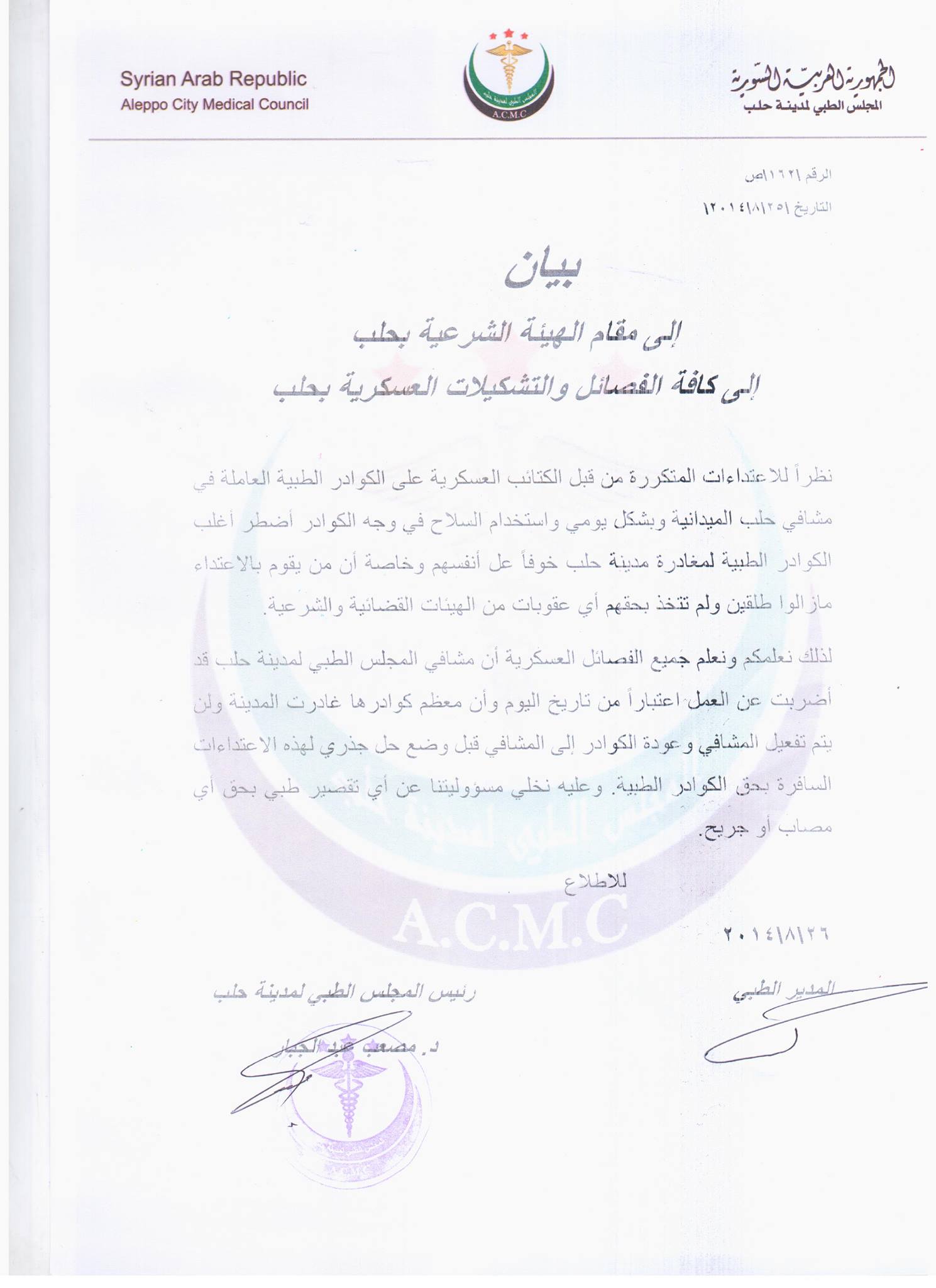 بيان من المجلس الطبي لمدينة حلب وريفها يعلن فيه إضرابه عن العمل بسبب الاعتداءات المتكررة كوارده