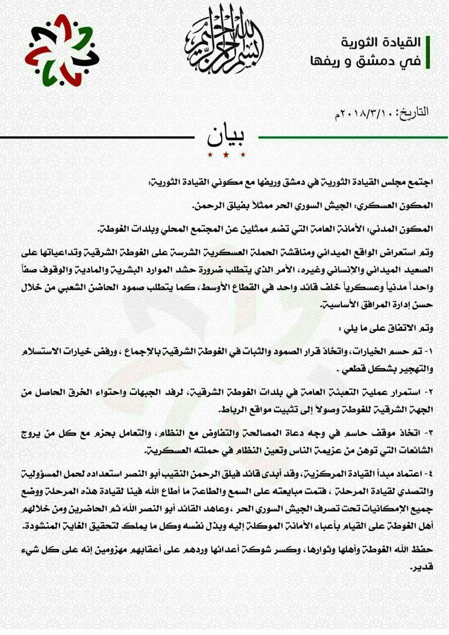 بيان حول اجتماع القيادة الثورية في دمشق وريفها بشأن الوضع في الغوطة الشرقية