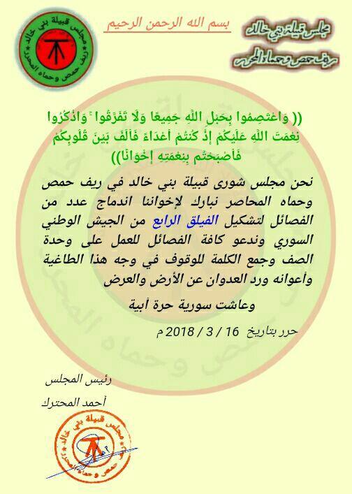 مجلس قبيلة بني خالد في ريف حمص الشمالي وحماة الجنوبي يبارك تشكيل الفيلق الرابع التابع للجيش الوطني