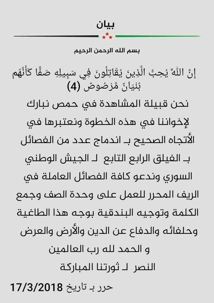 قبيلة المشاهدة في حمص تبارك تشكيل الفيلق الرابع التابع للجيش الوطني