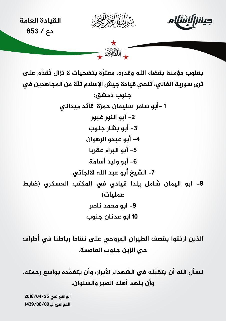 جيش الإسلام ينعي عدداً من قادته ومقاتليه في جنوب دمشق بعد استهداف نقاطهم بالبراميل المتفجرة