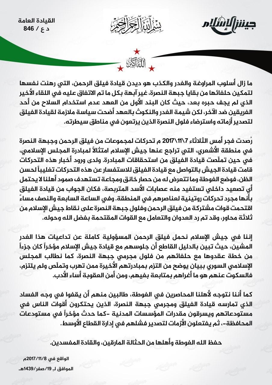 بيان حول ما أقدم عليه تحالف فيلق الرحمن و جبهة النصرة، ومطالبة المجلس الإسلامي السوري بتوضيح نتائج المبادرة.
