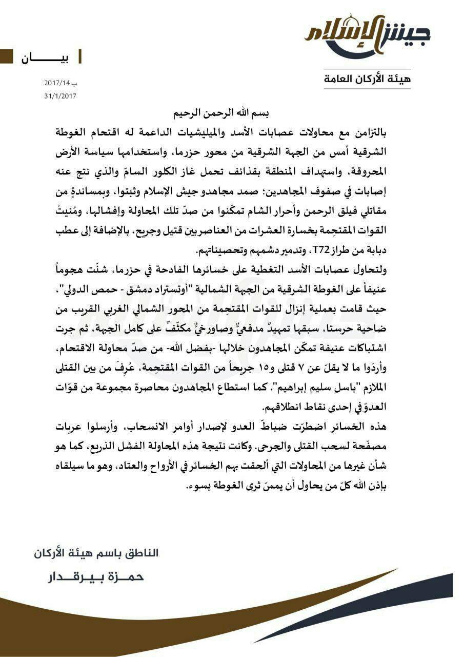 بيان من جيش الإسلام عن الوضع الميداني خلال 24 ساعة الماضية في الغوطة الشرقية